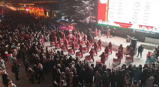 傍晚時分,雪韻大街迎來首輪狂歡高潮。舞獅、高蹺民俗表演霸氣開場,金獅騰躍、高蹺翻飛,鑼鼓聲中盡顯傳統年俗的獨特魅力;秧歌、腰鼓隊沿街巡游,火紅的綢帶與雪白的世界相映成趣,《東北大秧歌曲》《腰鼓鼓點曲》的歡快節奏,勾勒出一幅熱鬧非凡的冬日畫卷。
