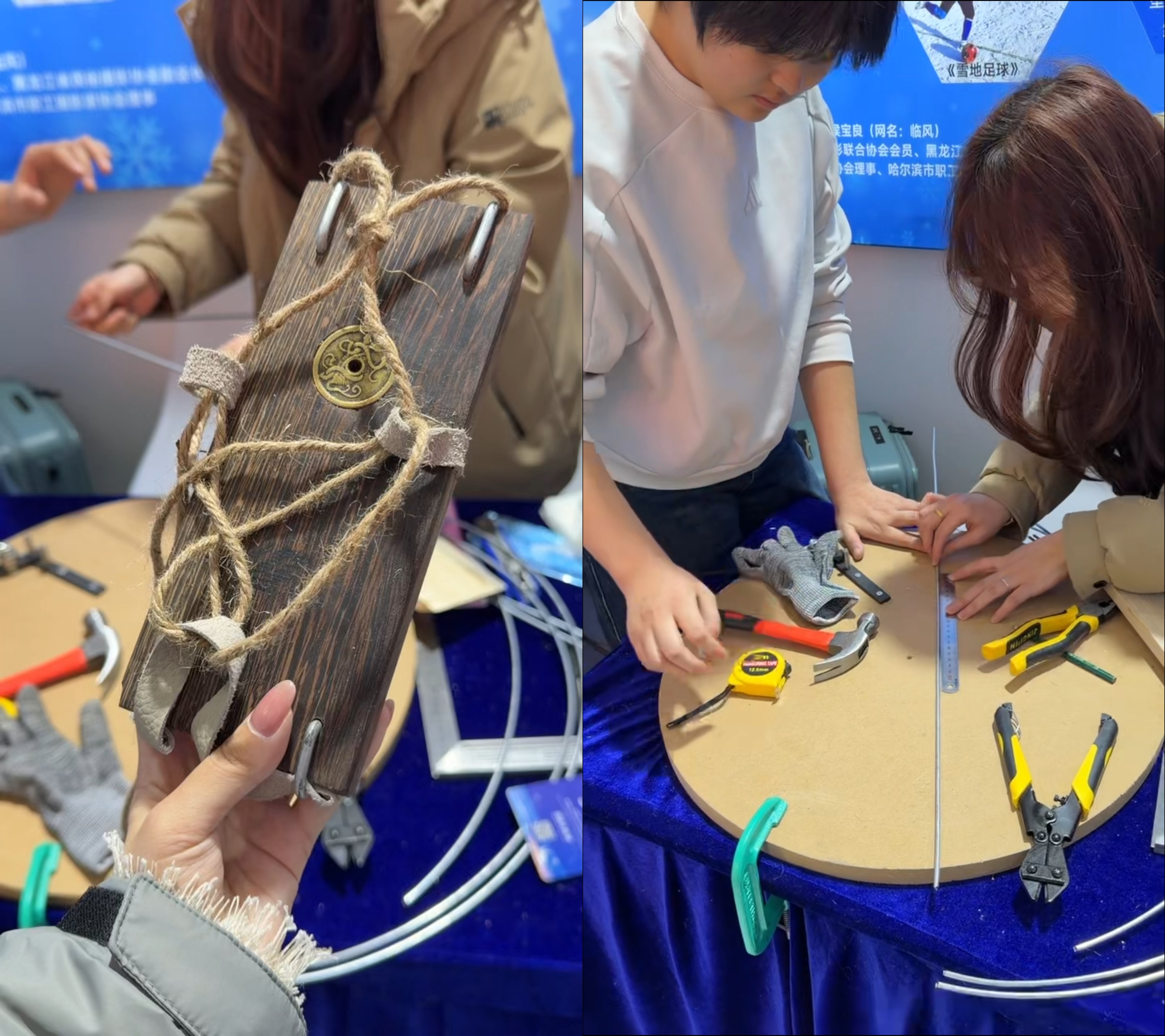 “哇,這不是我們小時候玩的‘腳滑子’嗎!”很多參觀的游客驚訝地發現展會現場竟然有現場制作的“腳滑子”。展區志愿者陸川林告訴記者,“這其實是一項傳統手藝,只要一塊木板,兩根粗鐵絲就能制作,穿在腳上就是一雙冰鞋,可以在冰上娛樂。”