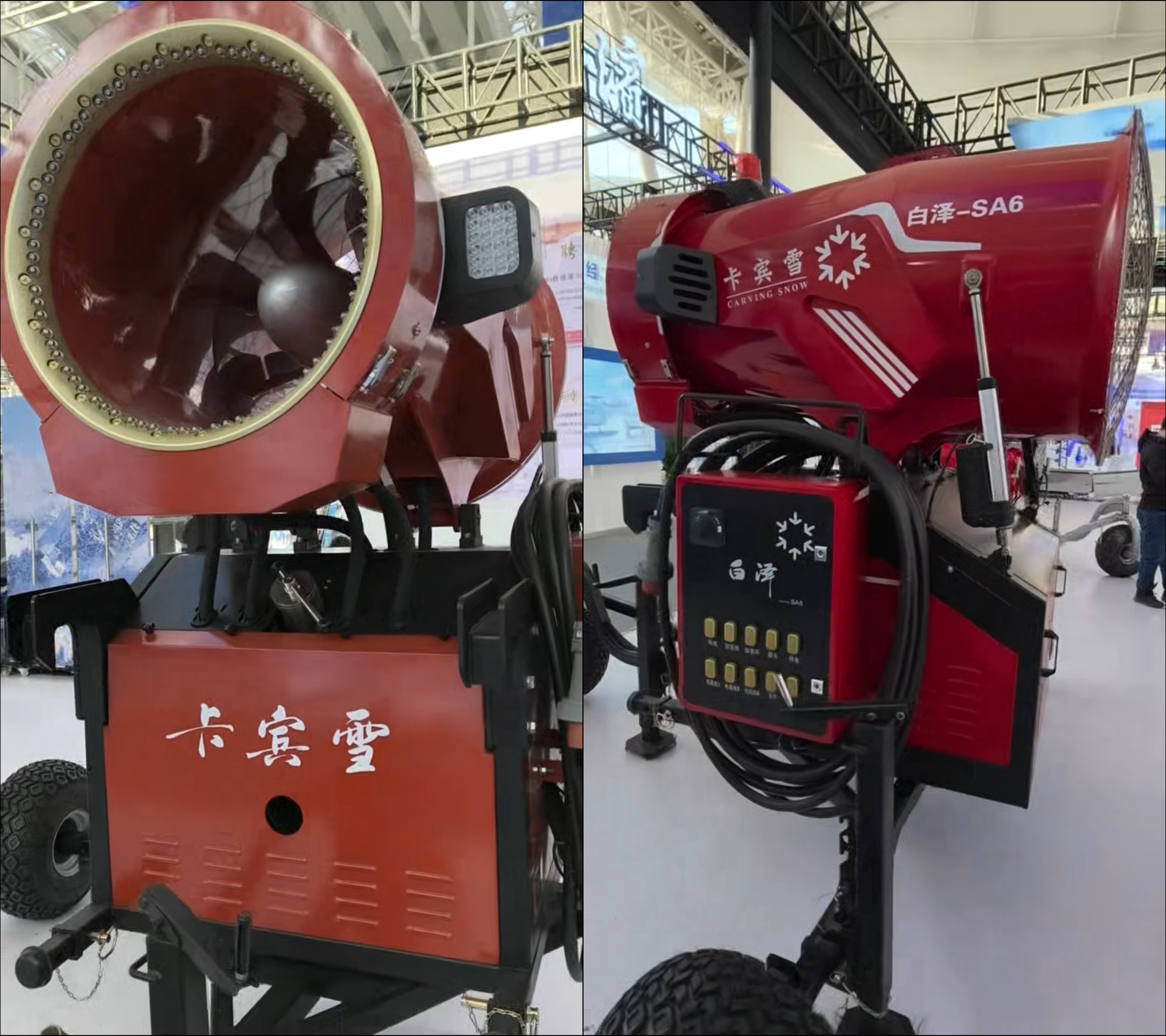 記者在卡賓滑雪的展臺看到,數臺型號不同的紅色造雪機“威風凜凜”地展示在展臺上。北京卡賓滑雪體育發展集團股份有限公司總裁于洋告訴記者,“我們的造雪機是國家重點專項項目,是屬于完全自主研發的產品,目標是替代國外產品。”